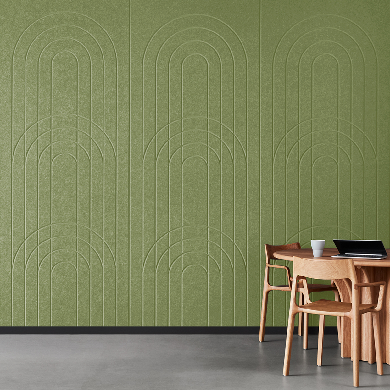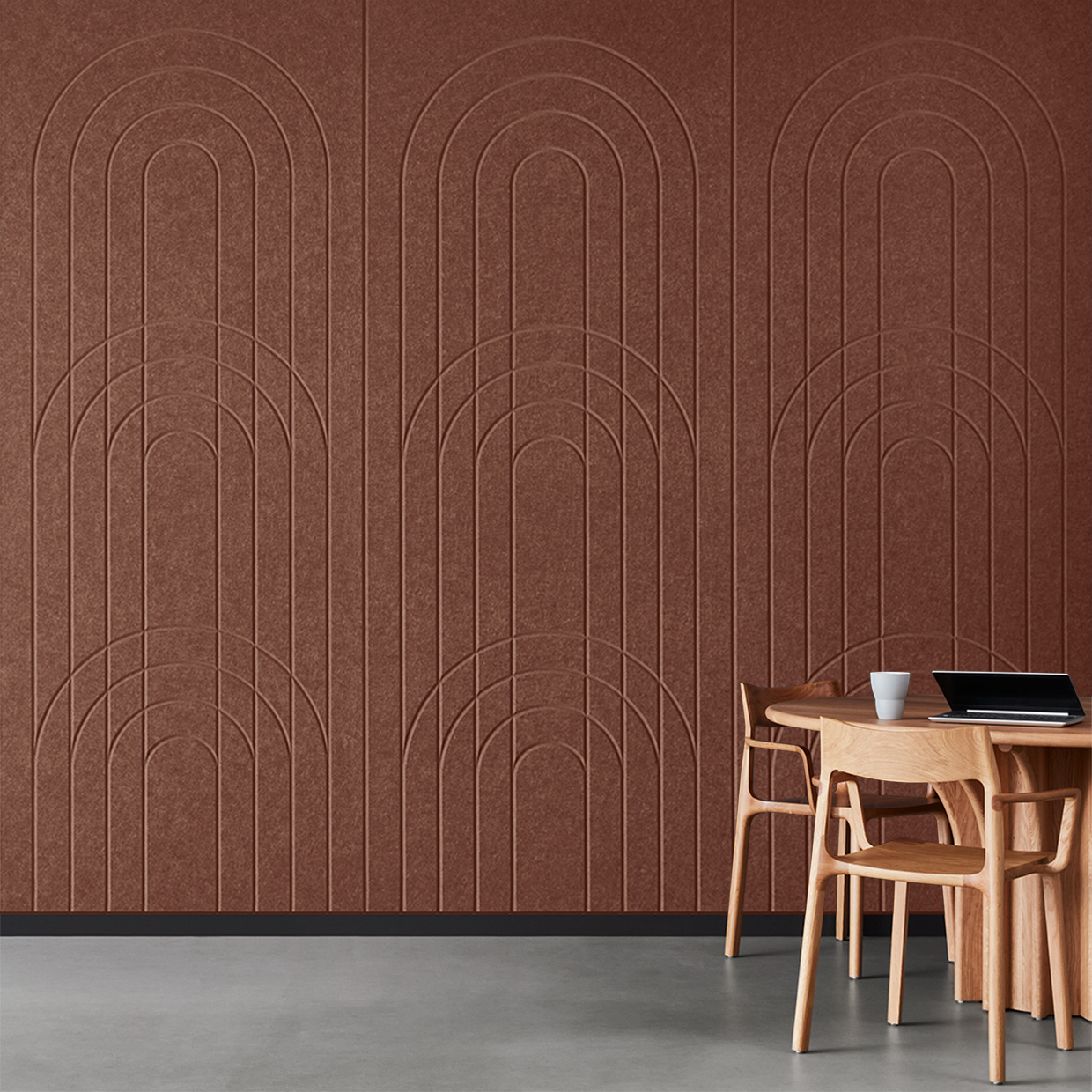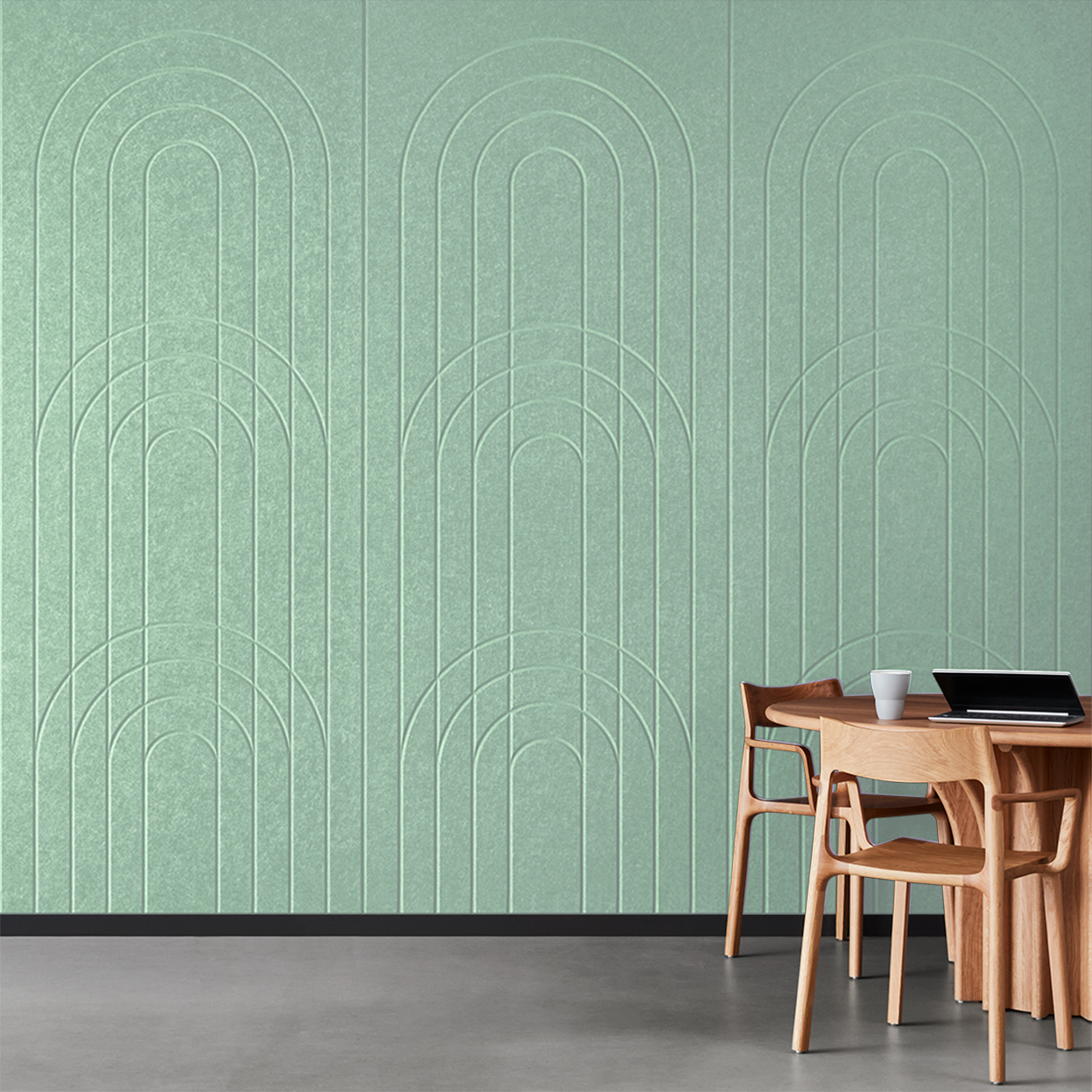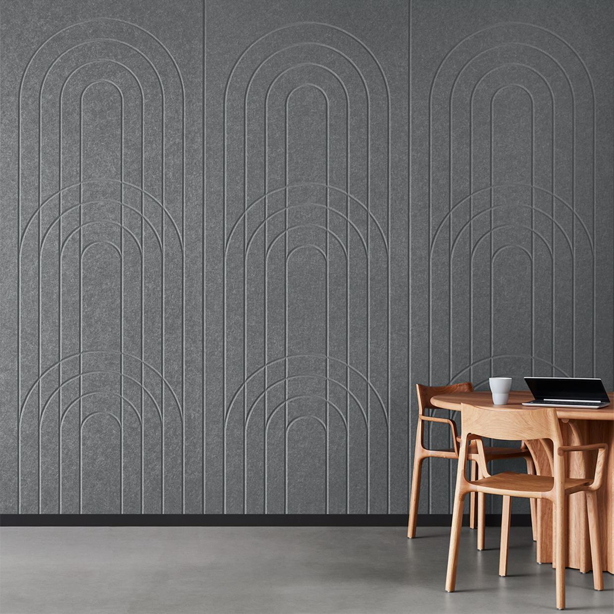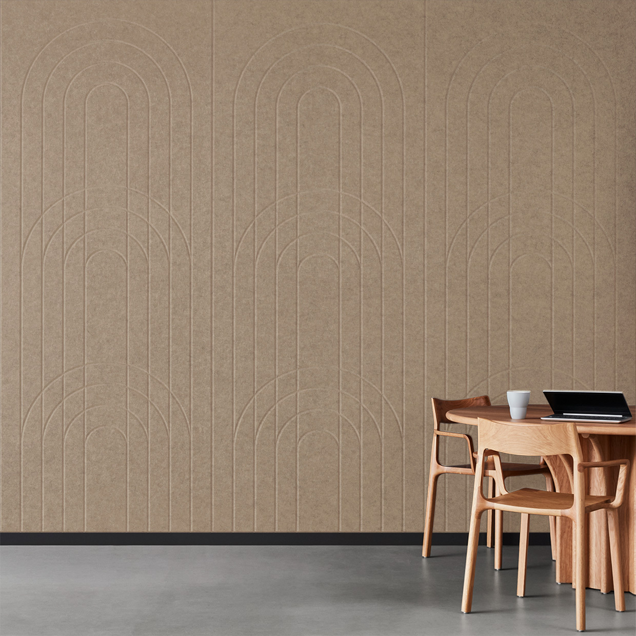 EchoPanel® Empire akustilised paneelid loovad kauni tasakaalu kaarte ja vertikaalsete joonte vahel, tuues interjööri õrna elegantsi.