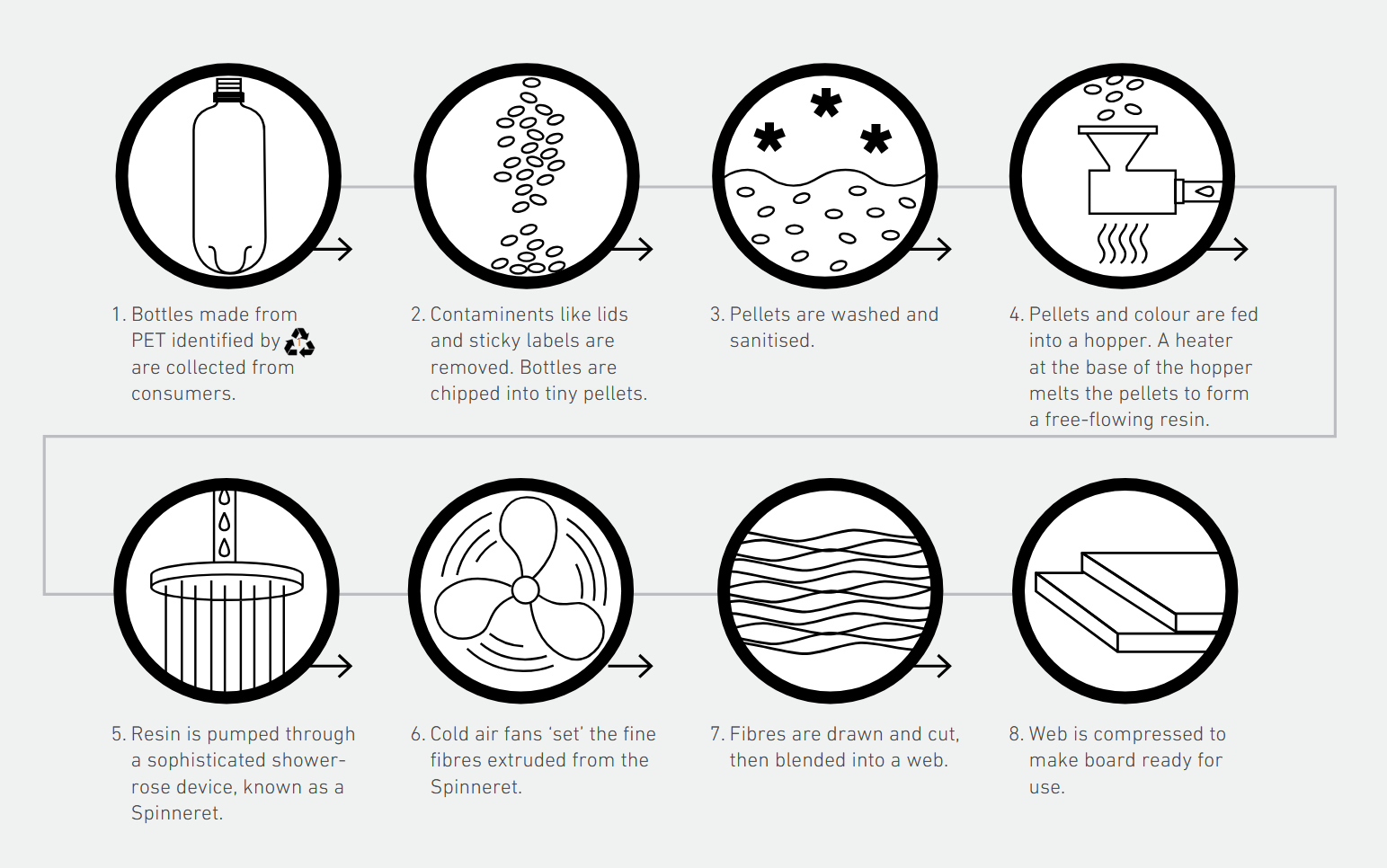 EchoPanel® ja Mura™ paneelid on valmistatud PET-kiust (polüetüleentereftalaat), mis sisaldab kuni 60% ulatuses tarbijajärgsest plastist (post-consumer PET) toodetud materjali. See tähendab, et paneelide valmistamisel kasutatakse taaskasutatud plastpudeleid, mis muidu jõuaksid jäätmetena keskkonda või prügilasse. Ülejäänud osa materjalist koosneb madala sulamistemperatuuriga PET-kiust, mis aitab paneelidele anda tugevuse ja vastupidavuse.